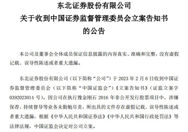 具体来看,此前2023年2月6日东北证券公告,公司于当日收到中国证监会《立案告知书》。因公司在执行豫金刚石2016年非公开发行股票项目中,涉嫌保荐、持续督导等业务未勤勉尽责,所出具的文件存在虚假记载、误导性陈述或者重大遗漏,根据《中华人民共和国证券法》《中华人民共和国行政处罚法》等法律法规,中国证监会决定对公司立案。