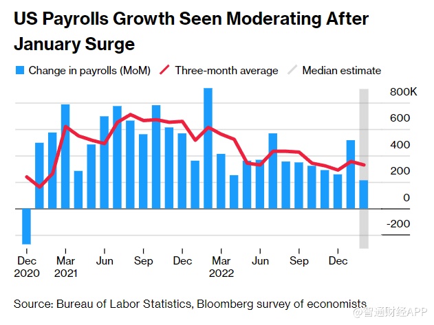 政策制定者将仔细审查2月份的数据,以了解三个关键指标,即工资、工资增长率和失业率。如果这些数据都指向一个强劲的劳动力市场,甚至可能只是略微超过预测,那都将指向更大幅度的加息。