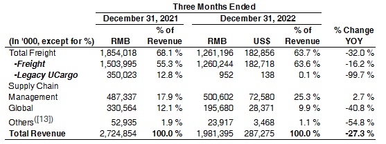 按业务划分,在货运业务量同比下降7.6%的情况下,货运整体业务营收12.61亿元,同比下降32.0%;供应链管理业务营收5.01亿元,同比增长2.7 %;全球业务营收1.96亿元,同比下降40.8%;其他业务营收2391.7万元,同比下降54.8%。