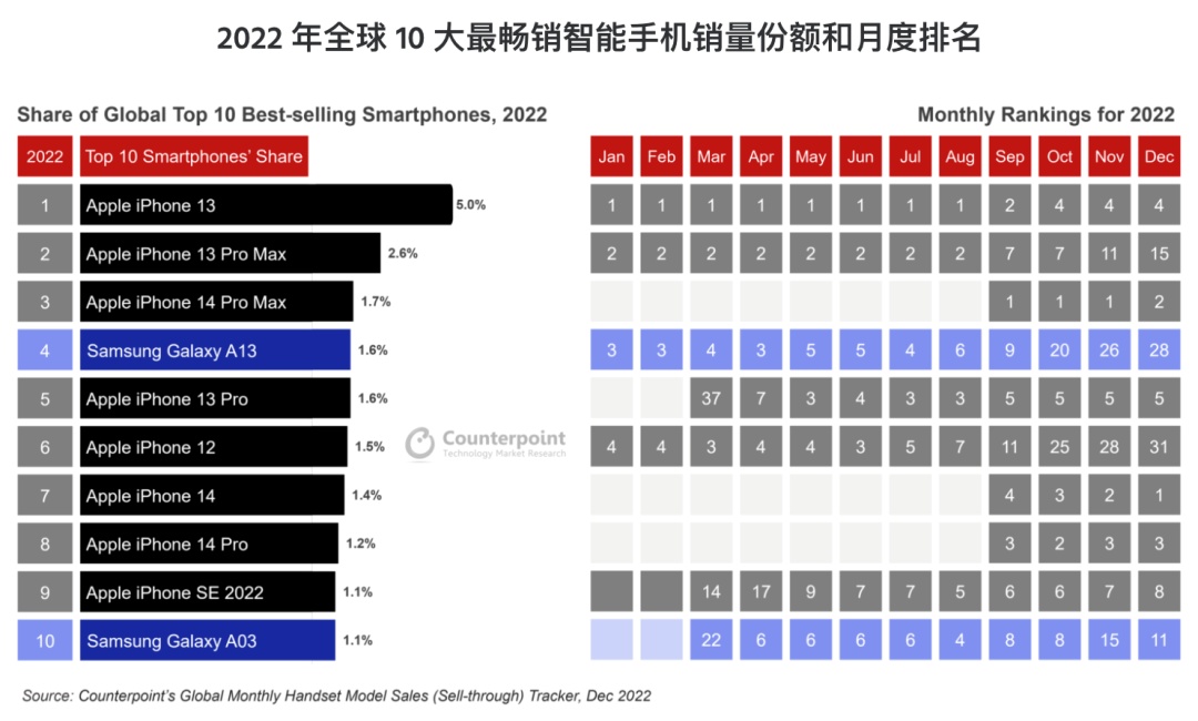 的全球月度手机机型销量追踪显示,苹果(AAPL.US)成为2022年十大畅销智能手机排行榜中首个独占八席的品牌。三星占据其他两席。2022年,该榜单的前十款手机占全球智能手机总销量的19%,与2021年相同。预计到2023年,前十款智能手机的综合市场占有率将会持续增加。