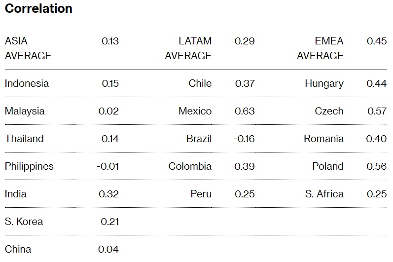 拉美债券也更容易受到美国收益率波动的影响,因为拉美与美国的贸易联系更紧密,而且墨西哥等国家的政策制定者倾向于与美联储同步加息。