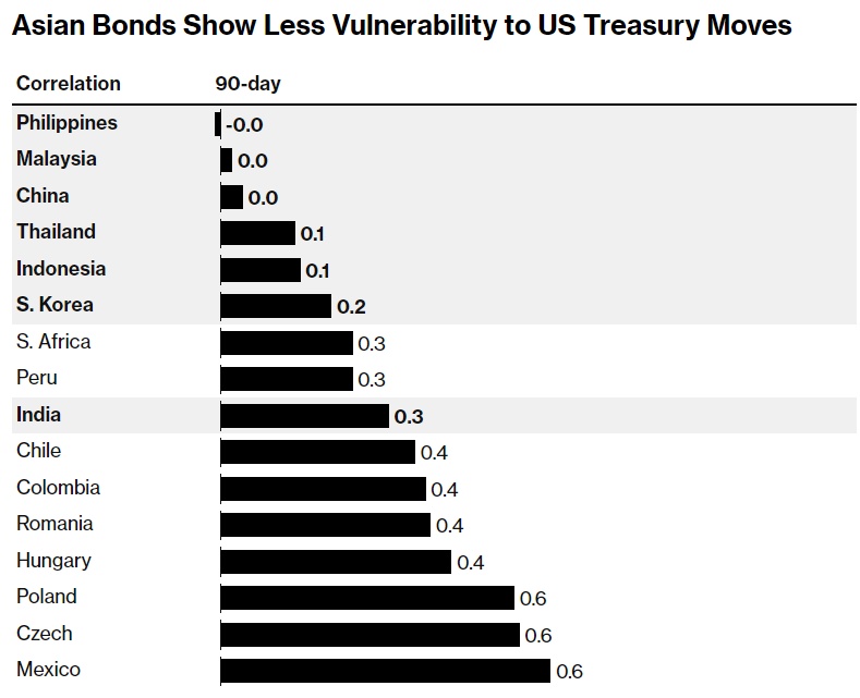 智通财经APP获悉,在美联储主席出人意料的强硬言论加剧了对美国国债的抛售之后,亚洲债券看起来比其他新兴市场债券更有能力承受进一步的波动。相对于欧洲、中东、非洲和拉丁美洲等新兴市场地区,亚洲债券对美国国债收益率走势的敏感度较低,因其基本面普遍更为强劲。