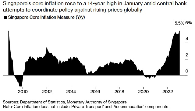 数据显示,1月份新加坡核心通胀率升至5.5%,达2008年11月份以来新高,主要原因是服务、食品、零售和其他物品的价格升高,以及消费税年初由7%上调至8%。;包括私人交通和住宿成本在内的整体通胀率升至6.6%,较2022年12月份的6.5%略微走高。