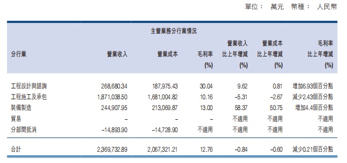 然而,工程设计与咨询与装备制造业务的增长弥补了部分营收缺口,两项业务收入分别为26.87亿元与24.49亿元,同比分别上涨9.62%与58.37%。营收规模增长的同时,两项业务的毛利率也有上升,工程设计与咨询与装备制造业务毛利率分别为30.04%与13%,同比增加6.93个百分点和4.4个百分点。由于两项业务规模与盈利水平的大幅提升,使得在第一大业务下滑的同时,公司的收入同比微降0.84%,毛利率同比减少0.21个百分点,几乎与去年持平。