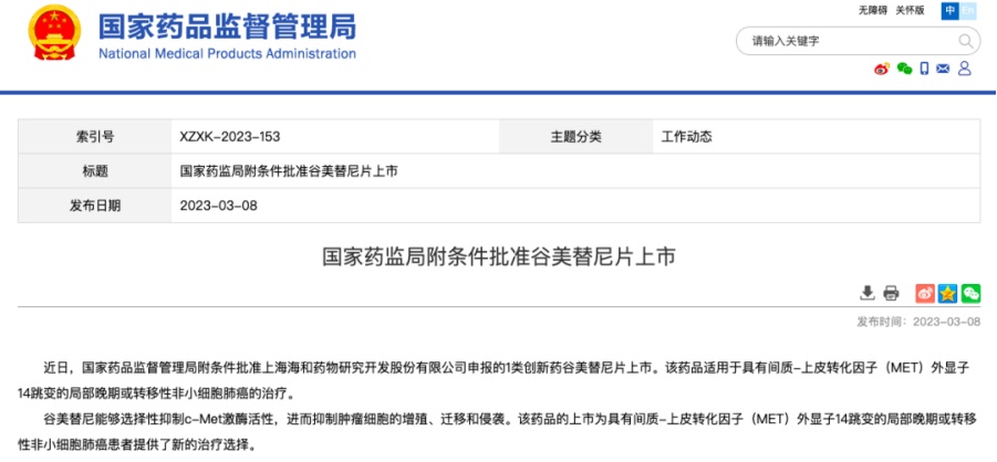 3月8日,国家药监局发布公告,附条件批准海和药物申报的1类创新药谷美替尼片上市,用于具有间质-上皮转化因子(MET)外显子14跳变的局部晚期或转移性非小细胞肺癌(NSCLC)的治疗。