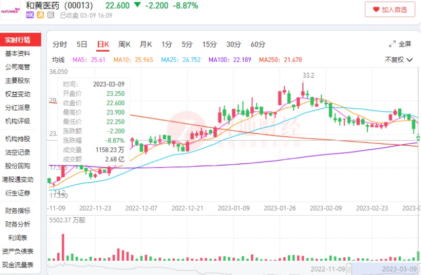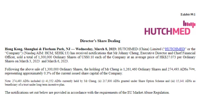 值得一提的是,在市场对和黄医药财务表示担忧时,3月3日和3月6日,和黄医药现任CFO以27.073港元的平均价格出售合共130万股股票,价值3519.5万港元,这次出售股份数约占他此前总持有量的一半,而这或许成为了导致其3月8日股价大跌的导火索。