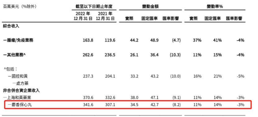 在不考虑合作方分成情况下,虽然核心的三款产品同比增长率达到32%、178%和159%的喜人成绩,但从销售绝对额来看,公司三款已商业化的肿瘤创新药的实际销售额仅为1.67亿美元。而根据和黄医药2022年年报显示,上海和黄药业旗下的中药产品麝香保心丸当期销售额达到3.41亿美元。