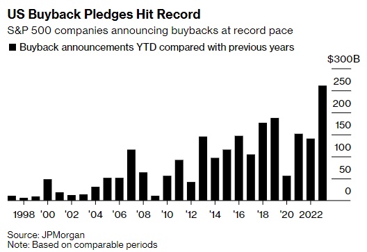 摩根大通策略师表示,过去12个月,标普500指数成份股公司宣布的股票回购总额为8530亿美元,相比之下,2019年5月的峰值约为1万亿美元。