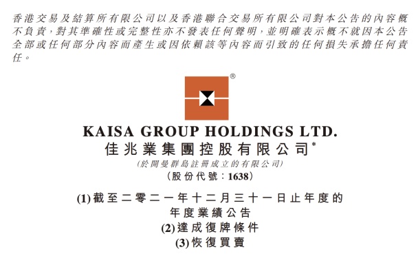 智通财经APP获悉,3月9日晚间,佳兆业集团控股有限公司(01638,以下简称“佳兆业集团”)发布2021年度业绩报告及2022上半年业绩报告。至此,佳兆业集团已达成全部复牌条件并将于3月10日9时起正式在香港联交所恢复买卖,标志着佳兆业风险化解工作取得重大突破。