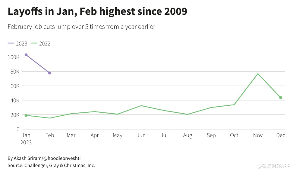 根据就业公司Challenger, Gray & Christmas的报告,仅在2月份,美国的裁员人数就达到了77770人,是一年前宣布的裁员15245人的五倍多。