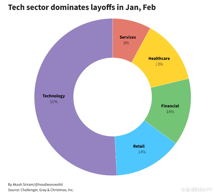 智通财经APP获悉,周四发布的一份报告显示,1月和2月美国公司的裁员人数达到了2009年以来的最高水平,在宣布的逾18万总被裁人数中,科技行业的被裁人数占了三分之一以上。