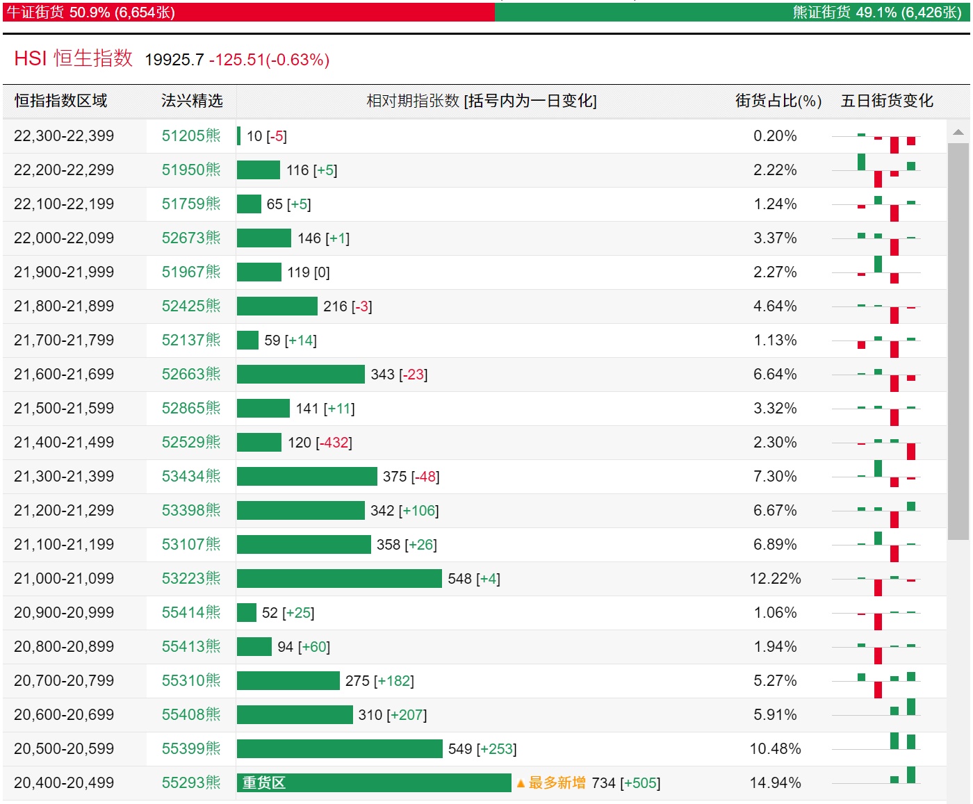 法兴恒指牛熊证街货分布图中的数据显示,熊证街货重货区和最多新增都在20400-20499区间,该区间最新熊证数量为734张,较上一交易日增加505张。