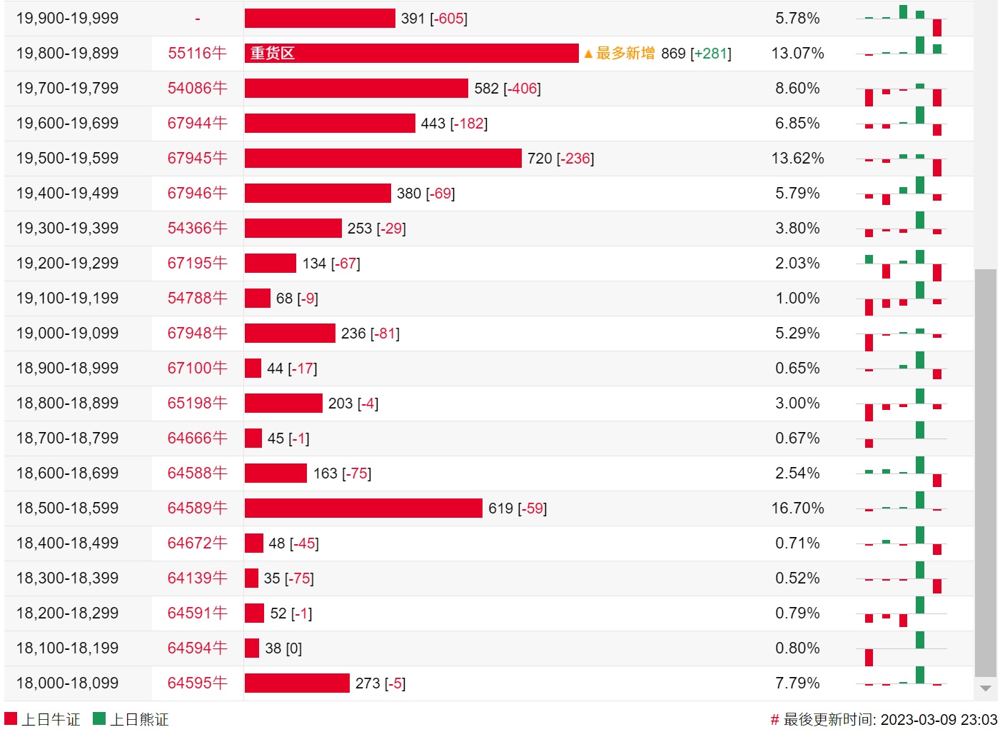 牛证街货重货区和最多新增都在19800-19899区间,该区间最新牛证数量为869张,较上一交易日增加281张。