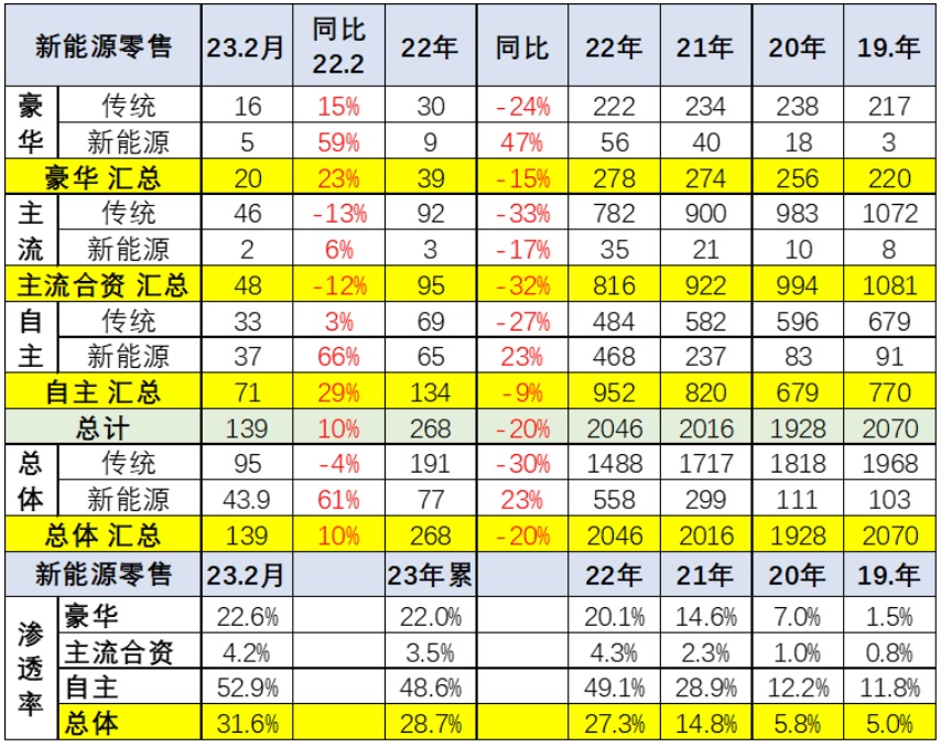 2月,自主品牌中的新能源车渗透率52.9%;豪华车中的新能源车渗透率22.6%;而主流合资品牌中的新能源车渗透率仅有4.2%。
