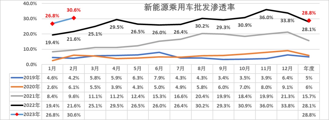 2月新能源车厂商批发渗透率30.6%,较2022年2月21.6%的渗透率提升9个百分点。