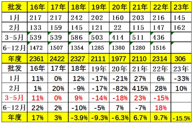 2022年4季度的销量总体处于中位,因此1月冲刺开门红的难度较大,部分企业考虑稳健销售实现2月的开门红。但由于地方经济的稳定需要,批发销量仍是冲刺一些。