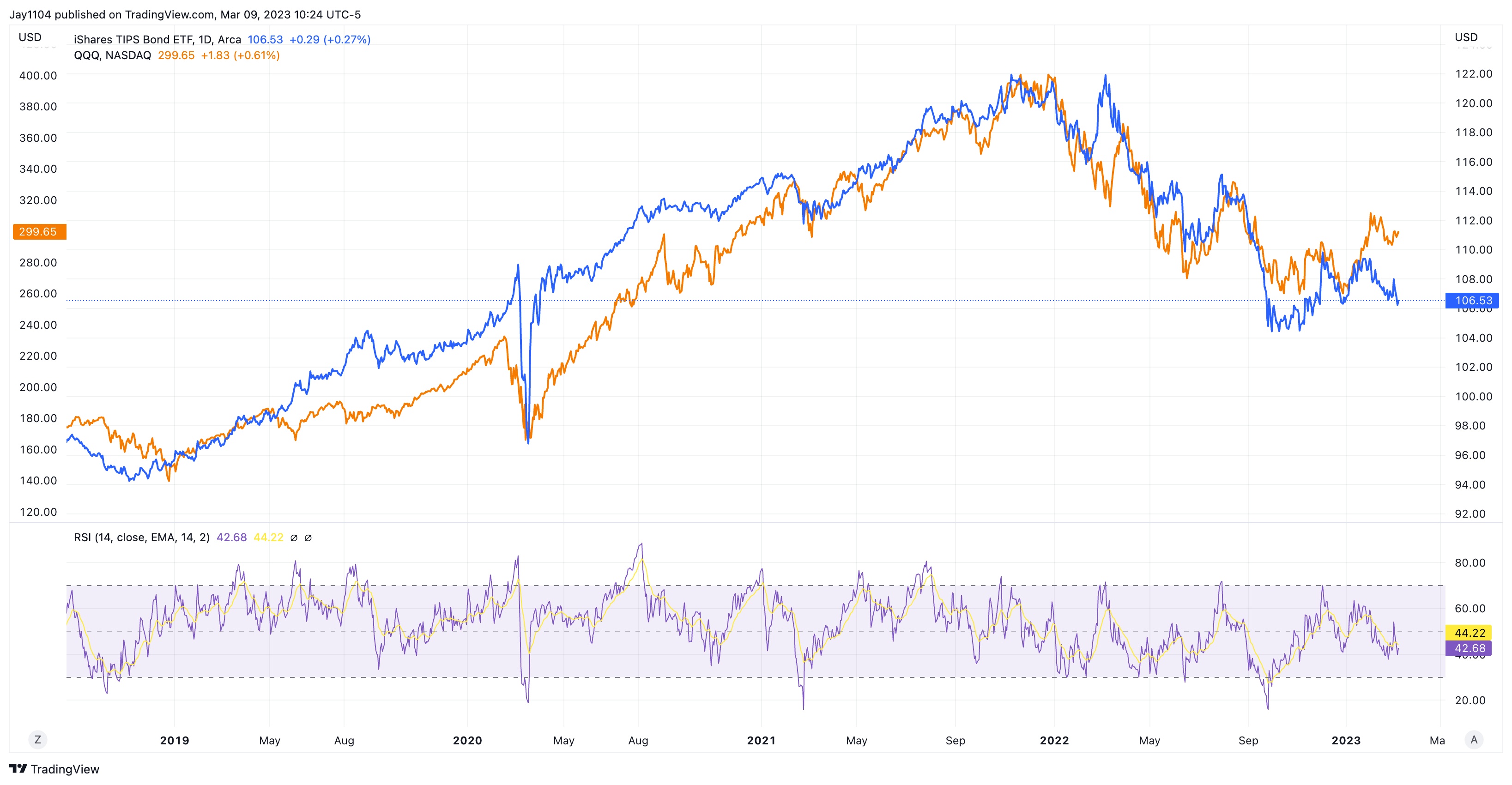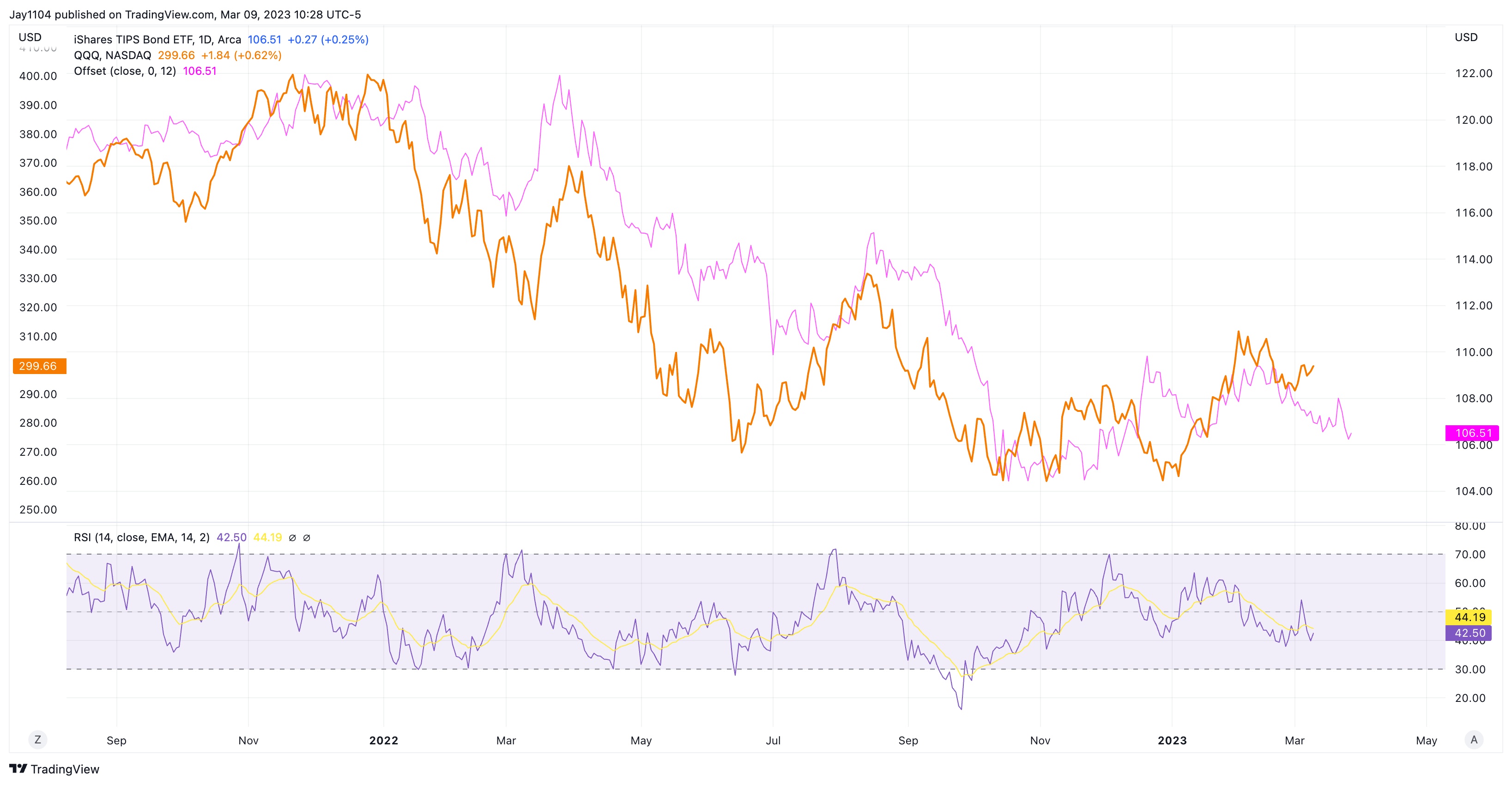 iShares TIPS债券ETF可能是衡量纳斯达克100指数及追踪该指数的ETF的较简单方法之一。若iShares TIPS债券ETF跌至此前低点并再创新低,那么纳斯达克100指数也不会落后它太多。
