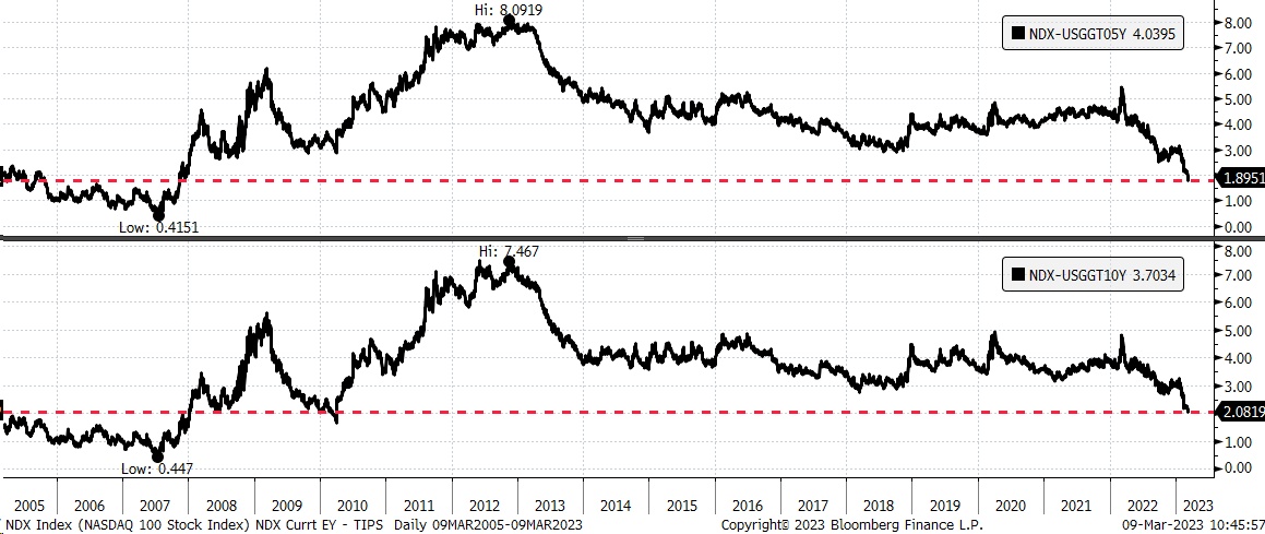 自鲍威尔于国会听证会上发表了鹰派言论以来,5年期和10年期通胀保值债券(TIPS)的实际收益率飙升至接近去年9月和10月高点的水平。这是一个关键的进展,因为在纳斯达克100指数在2023年初的上涨之后,目前该指数的收益率和美债实际收益率之间的差距是十多年来最窄的,这表明纳斯达克100指数相对于债券被高估了。