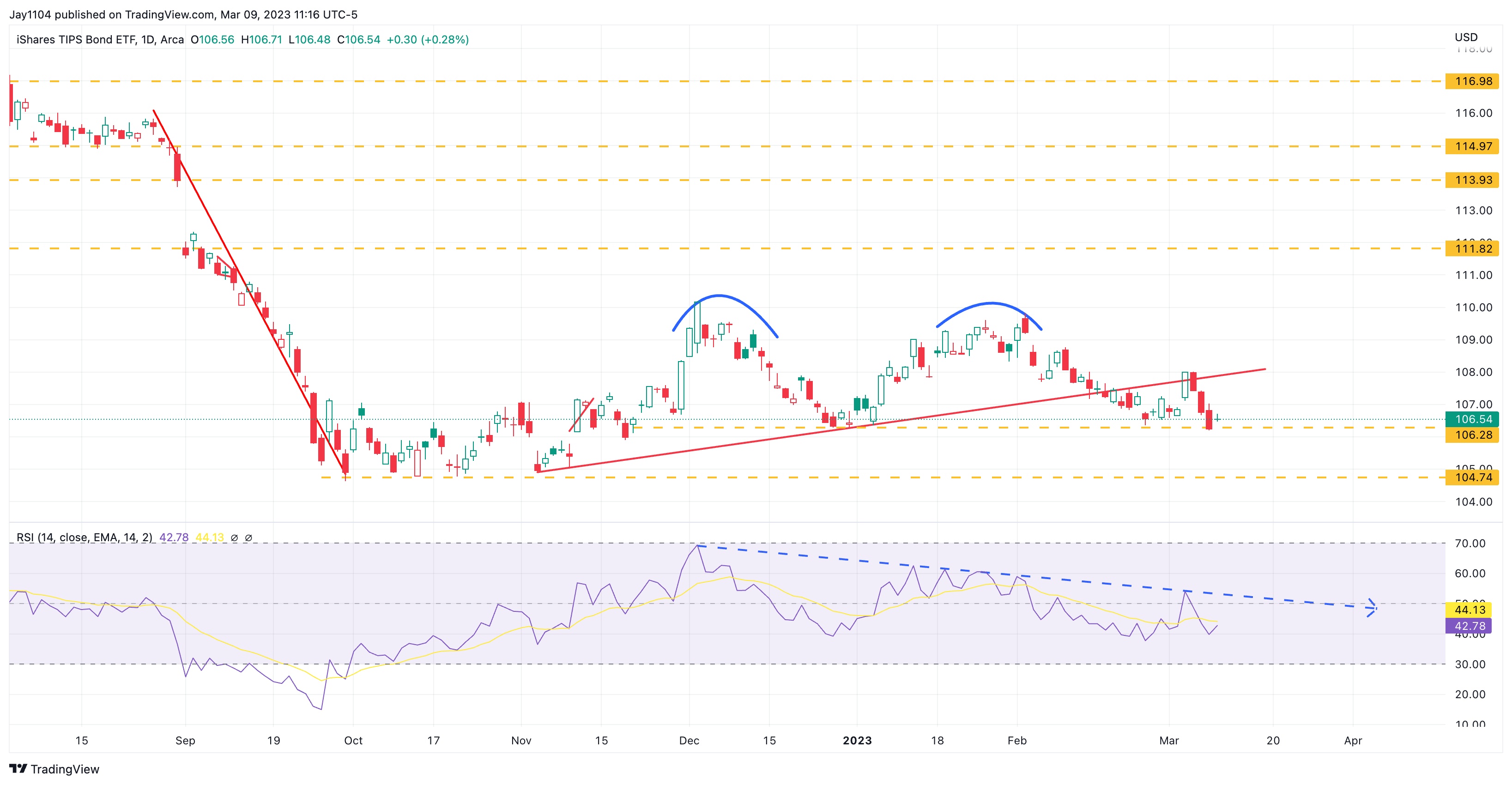 技术图表分析显示,iShares TIPS债券ETF创下新低的可能性似乎很大。iShares TIPS债券ETF正处于106.25美元的关键支撑位,若跌破这一技术支撑位,就没有太多因素可以阻止该ETF跌回104.75美元附近的低点。此外,iShares TIPS债券ETF的相对强弱指标显示出看跌势头,表明该ETF未来将走低。