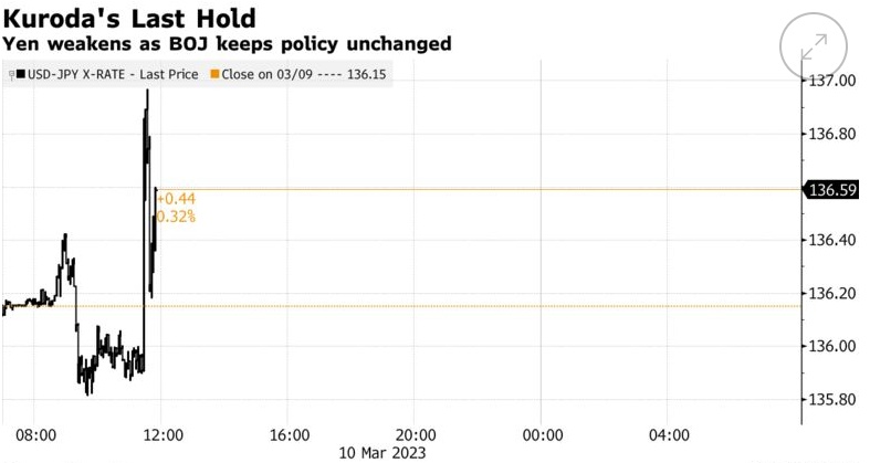智通财经APP获悉,周五,日本央行维持宽松政策不变。日本央行行长黑田东彦在其任期10年的最后一次会议上维持了宽松的立场。根据声明,日本央行维持负利率和收益率曲线控制(YCC)计划的政策设置不变,与预期一致。日本央行做出上述决定后,日元走软,美元兑日元一度从135.96升至136.97。
