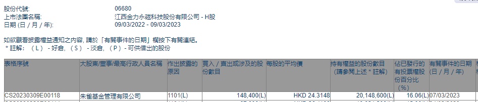智通财经APP获悉,香港联交所最新资料显示,3月7日,朱雀基金增持金力永磁(06680)14.84万股,每股作价24.3148港元,总金额约为360.83万港元。增持后最新持股数目为2014.86万股,最新持股比例为16.06%。