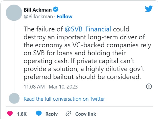 阿克曼在一系列推文中表示,有风险投资支持的公司会利用硅谷银行获得贷款和运营现金,而硅谷银行的倒闭可能会破坏对经济至关重要的长期推动力。