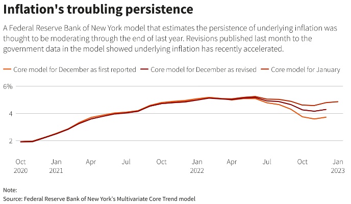 纽约联储经济学家表示,1月的MCT实际读数“为近期通胀持续的动态提供了一种与新发布数据前截然不同的说法”。该模型中通货膨胀的上升是由核心商品通胀和核心服务通胀(不包括住房)所推动的。尤其是非服务型通胀的粘性,一直是包括美联储主席杰罗姆·鲍威尔在内的美联储决策者所关注的问题,其曾多次指出美联储在降低通胀方面缺乏进展。