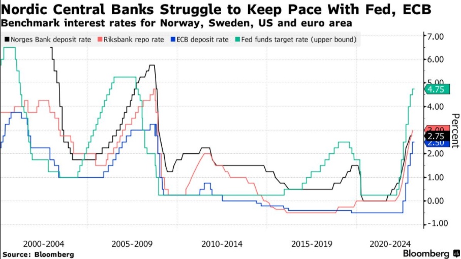 因此,考虑到通胀依然难以抑制,交易员们不再押注欧洲央行和美联储今年会降息,他们现在预计这两家央行的关键利率将分别升至4%和5.6%以上。与此同时,据SEB跟踪的市场定价显示,瑞典的利率预计最多将升至4%左右,而挪威的基准利率预计将达到3.75%左右的峰值。