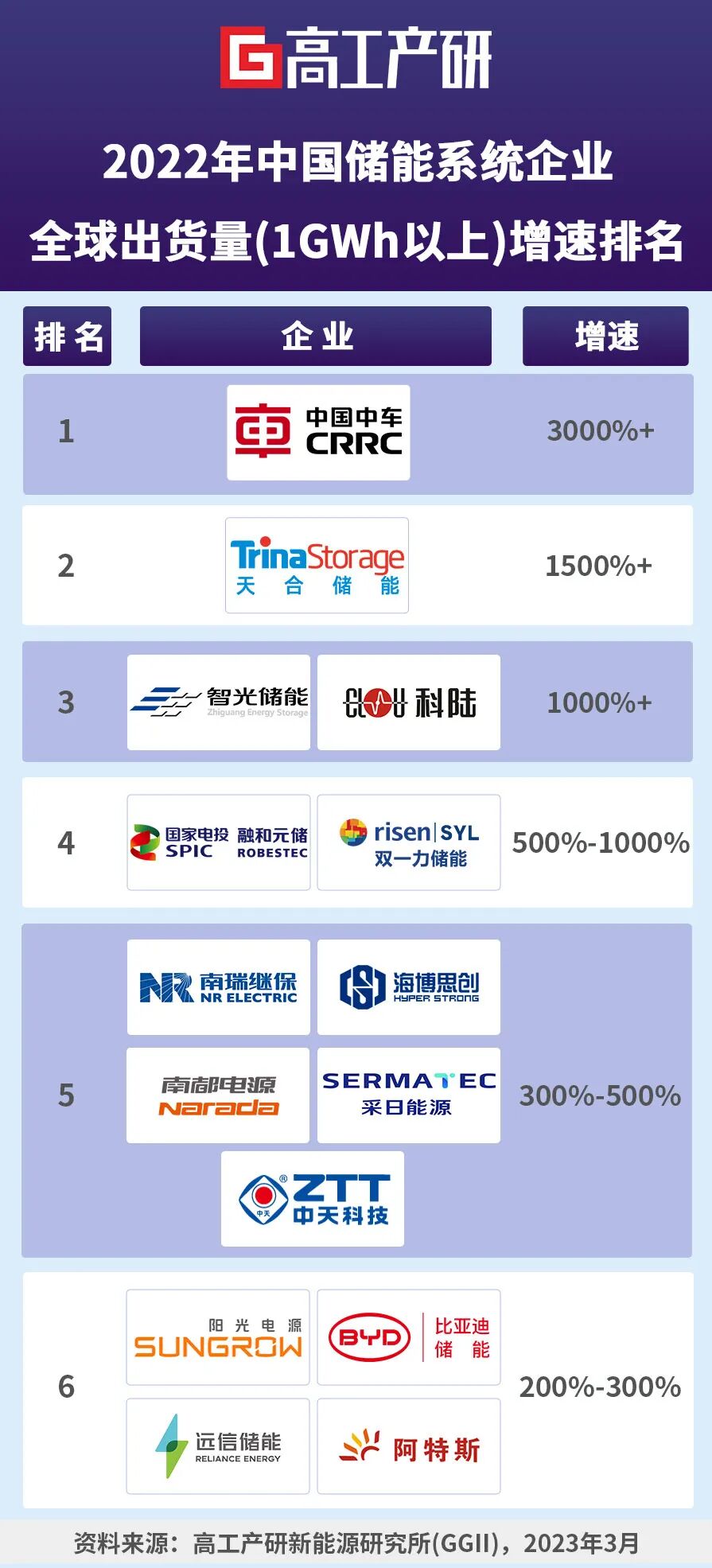 智通财经APP获悉,据高工产业研究院(GGII)调研统计,2022年中国储能系统企业出货量合计达50GWh,同比增长超200%。2022年受益于全球储能市场的高景气度,作为全球市场的主要供应方,中国本土储能系统企业发展迅猛,出货量大涨。