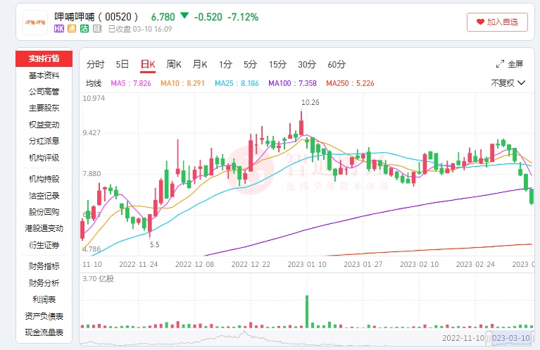 受此业绩盈警影响,自3月7日以来,呷哺呷哺股价累跌超20%。目前报于6.78港元,相比2021年2月26.5港元的历史高点,回落近75%,最新市值为73.64亿港元(截至3月10日收盘)。