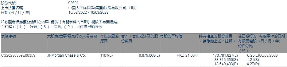 智通财经APP获悉,香港联交所最新资料显示,3月6日,小摩增持中国太保(02601)887.9068万股,每股作价21.6344港元,总金额约为1.92亿港元。增持后最新持股数目约为1.74亿股,最新持股比例为6.25%。