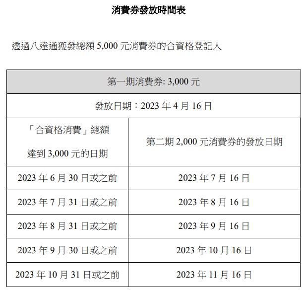 于去年使用支付宝香港、BoC Pay、PayMe from HSBC、Tap & Go“拍住赏”和WeChat Pay HK收取消费券的市民,将会于四月十六日经同一帐户收到一张3000港元消费券,有效期至今年十月三十一日。余下的2000港元第二期消费券将在七月十六日发放。