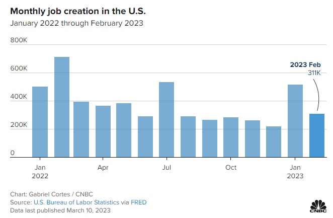 智通财经APP获悉,尽管美联储一直在努力减缓经济增长并降低通胀,但最新就业数据显示,美国2月非农就业新增31.1万,较前值有所放缓,但仍超出了预期的22.5万。失业率为3.6%,高于预期的3.4%。