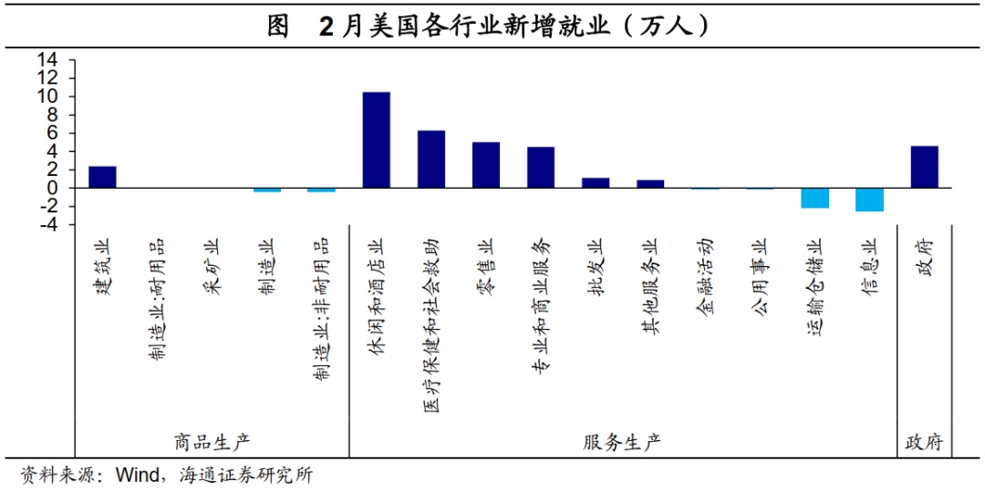 分行业来看,服务业仍是主要贡献。2月服务业新增就业24.5万人,贡献了新增就业的78.8%,其中,贡献最大的是休闲和酒店业、教育和保健业以及专业和商业服务,分别贡献了33.8%、23.8%以及14.5%。