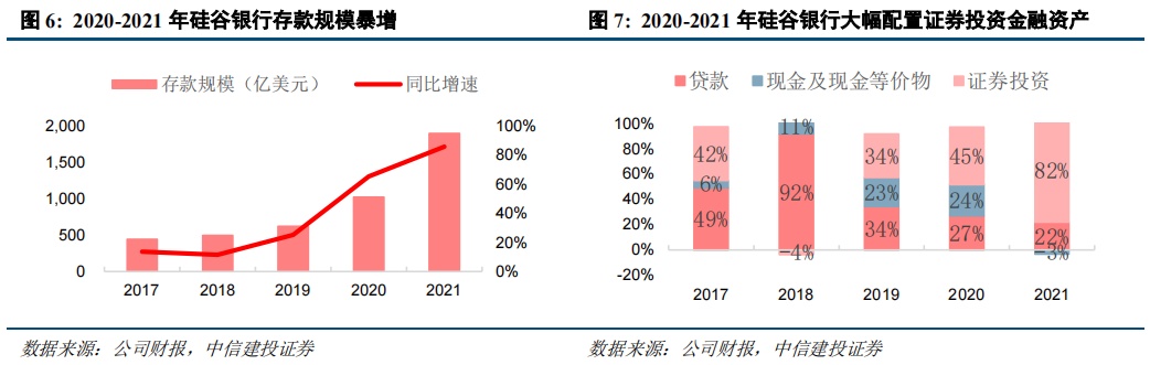 资产端,硅谷银行现金及高流动资产配置比例偏低,长久期的AFS和HTM等投资证券占比过高,资产负债久期严重错配。2020-2021年疫情期间,美国货币政策宽松,利率水平降至历史低位,美元流动性从严重短缺转向极度充裕。在这种背景下,科技创投领域发展快速,PE/VC市场极度火热,硅谷银行借此获得了大量的客户低息或无息存款,2020、2021年存款规模增长分别高达65.1%、85.5%,面对突然激增的可用资金,硅谷银行选择将大部分资产投资于长期限国债、MBS等金融资产,这为后续硅谷银行爆发流动性危机埋下了伏笔。2021年,证券投资类资产增量占比高达82%,投资类金融资产规模达1279.6亿美元,占总资产比重达61%,其中MBS等持有至到期金融资产(HTM)和长期限国债等可供出售的金融资产(AFS)分别为972.27、177.59亿美元,分别较2020年增加了800、135亿美元,这意味着硅谷银行几乎大部分的金融资产是在2021年配置的,且合计增量已超过2021年的存款增量,激进的资产配置导致硅谷银行现金等流动性资产占比由2020年的15%下降至2021年的7%,资产负债久期错配情况加深,流动性问题已初见端倪。