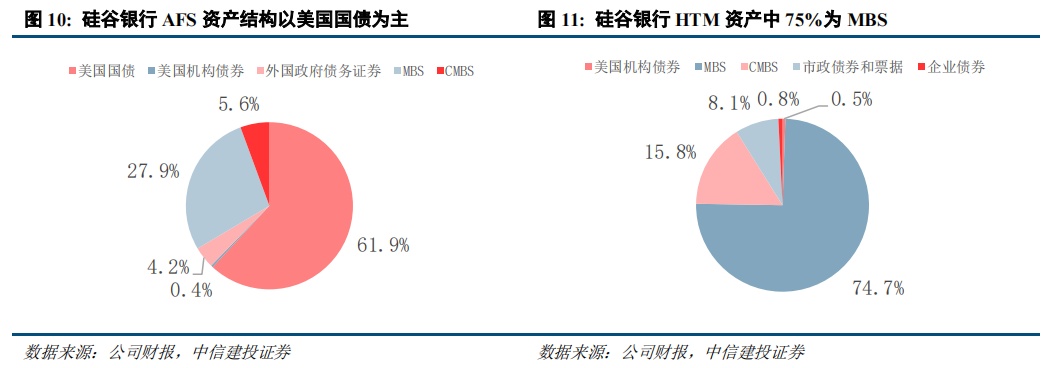 硅谷银行证券投资的资产质量非常优秀,我们认为风险蔓延的可能性极小,系统性影响与2008年不可同日而语。首先,本次事件与2008年的系统性风险完全不同,2008年的次贷危机是由房地产资产泡沫破灭引发的信用风险,直接在资产端出现大规模无法收回的坏账。而本次硅谷银行的破产是利率风险导致的,本质上是流动性风险,对系统冲击力度完全不同。硅谷银行本身是一家业务非常简单且优秀的银行,资产端配置的基本是国债和MBS等非常安全、流动性好的资产,而不是引发次贷危机的CDS、CDO等复杂不透明的高风险资产。截至2022年,硅谷银行AFS资产中61.9%为美国国债,HTM资产中75%为抵押支持证券(MBS),企业债券占比仅0.5%,硅谷银行的证券投资资产本身不产生坏账,没有信用风险。