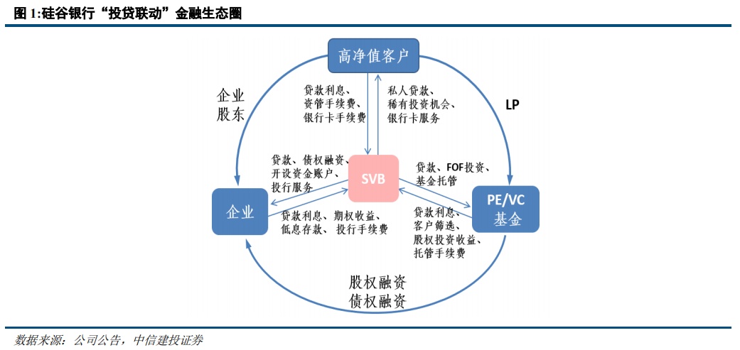 在分析本次风险事件之前,我们先对硅谷银行基本情况进行简单介绍:硅谷银行聚焦高科技高成长企业为主的对公业务,通过搭建投贷联动的金融生态圈,实现与科创企业客户和PE/VC基金的长期利益绑定和互赢发展。硅谷银行主要为科创企业提供贷款、债券融资等一系列综合金融服务,并以此获得科创企业客户的大量低息或无息存款。同时为PE/VC基金提供贷款、FOF投资等服务,并利用其尽调和投资结果来筛选企业发放贷款。