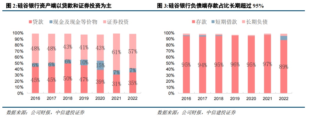 硅谷银行的资负结构非常简单,存贷业务利率优势显著。负债端,硅谷银行存款占比长期高达95%以上。硅谷银行服务创投企业,同时要求企业将经营账户开设在硅谷银行,吸收了大量不计息存款,近5年硅谷银行不计息存款平均占比高达74%(同业:33%),较低的存款成本基础是硅谷银行的竞争优势所在。资产端,硅谷银行主要以贷款和证券投资为主,2021年前,贷款和证券投资基本各占“半壁江山”,现金类资产占比在5%-15%之间。硅谷银行发放的创投企业贷款风险溢价高,同时通过股权或期权协议获得投资收益,贷款综合收益在长期限内显著领先于同业。在高收益、低成本的资负两端优势下,硅谷银行规模不断提升,ROE持续领先行业。