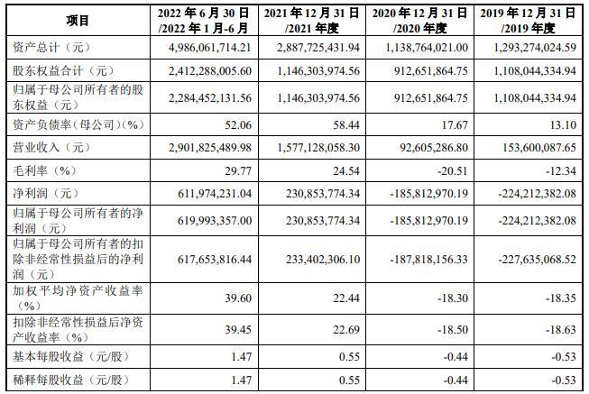 财务方面,2019年度、2020年度、2021年度和2022年1-6月,公司的营业收入分别约为1.54亿元、9260.53万元、15.77亿元和29.02亿元;同期,毛利率分别约为-12.34%、-20.51%、24.54%及29.77%。