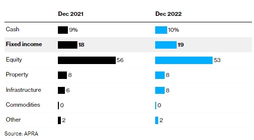 State和HESTA这样的公司来说,过早进入衰退贸易的风险太大了。数据显示,澳大利亚的养老金基金去年对固定收益的投资仅增加了一个百分点,至19%,但仍落后于日本和英国等债券占投资组合50%以上的同行。