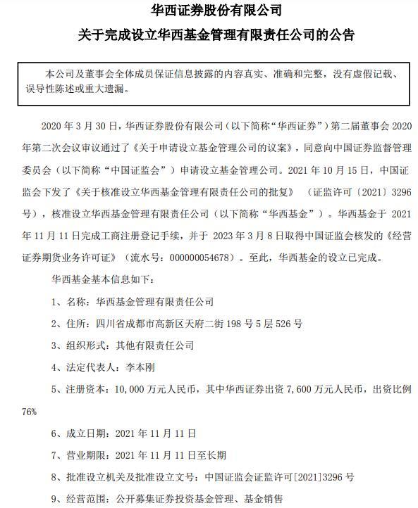 此前2021年10月15日,华西证券收到了证监会批复,核准设立华西基金。批复一是核准设立华西基金,注册地为四川省成都市,经营范围为公开募集证券投资基金管理、基金销售和证监会许可的企业业务;二是注册资本为10000万元人民币,华西证券出资7600万元人民币,出资比例76%;三是自批复之日起6个月内完成华西基金组建工作;四是华西基金在取得营业执照后,再领取经营证券期货业务许可证,在此前不得以该名称对外开展业务。自取得许可证起6个月内,应当发行公募基金产品。