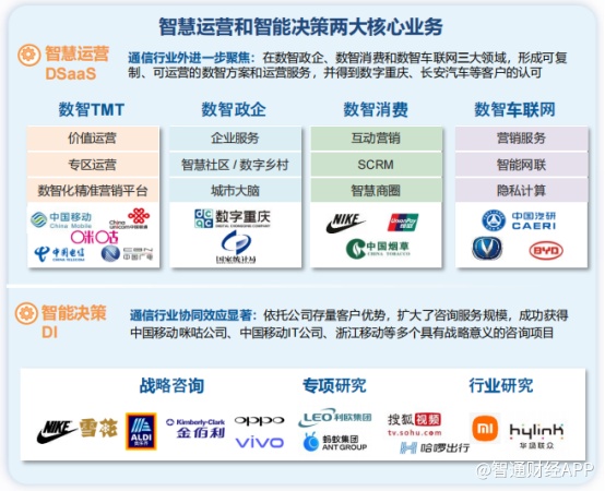 在数智运营业务中,主要涵盖智慧运营(DSaaS)与智能决策(DI)两大核心发展方向。智慧运营包括数智TMT、数智政企、数智消费和数智车联网,公司依托合法合规且丰富的数据源,利用创新领先的AI技术,开发出面向不同行业,不同应用场景的数智运营产品,赢得数字重庆、长安汽车等头部客户的认可;智能决策包括战略咨询、专项研究和行业研究等咨询服务,依托公司存量客户优势成功扩大咨询服务规模,获得中国移动咪咕公司、中国移动IT公司、浙江移动等多个具有战略意义的咨询项目。