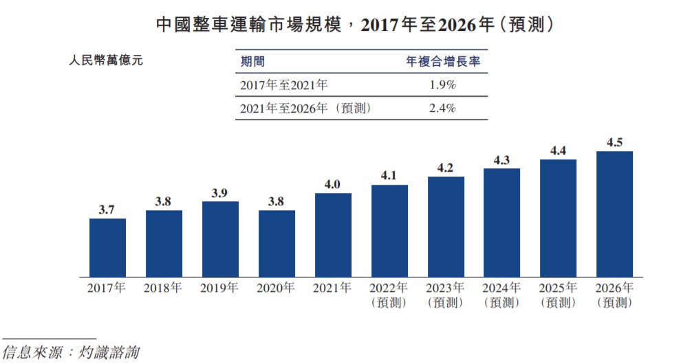 据灼识咨询数据显示,2021年中国的整车运输市场规模为4万亿人民币,随着我国经济的持续发展对货运需求的提升,至2026年时,该市场有望增至4.5万亿人民币,即五年有5000亿新增量,这表明整车运输行业仍是增量市场。