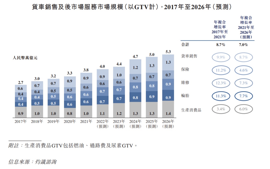据灼识咨询数据显示,货车销售及车后服务市场2021年的规模为3.8万亿,至2026年时,该行业的市场规模有望增长至5.3万亿,年复合增速7%。虽然维天运通目前的卡加服务仍处于探索和起步阶段,但这是一个超5万亿级别的市场,一旦维天运通充分挖掘手中注册司机用户的变现潜能,那么货车销售及车后服务市场将成为维天运通的新增长点。
