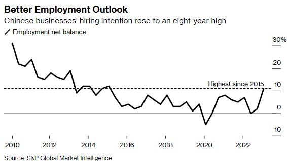 标普全球表示,随着经济反弹和新冠疫情限制结束后业务恢复正常,中国企业计划在未来一年增加招聘。