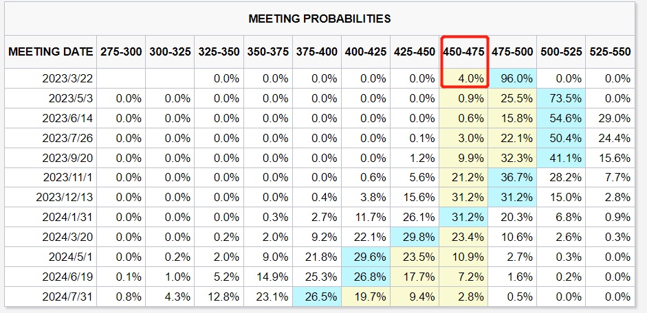 美联储目前被认为可能在下周加息25个基点,在上周四CME“美联储观察”工具曾显示美联储加息50个基点概率超过75%。OIS曲线显示,美国联邦基金利率可能在六个月内达到5%左右的峰值,远远低于上周三交易员们定价的5.74%的最终利率。