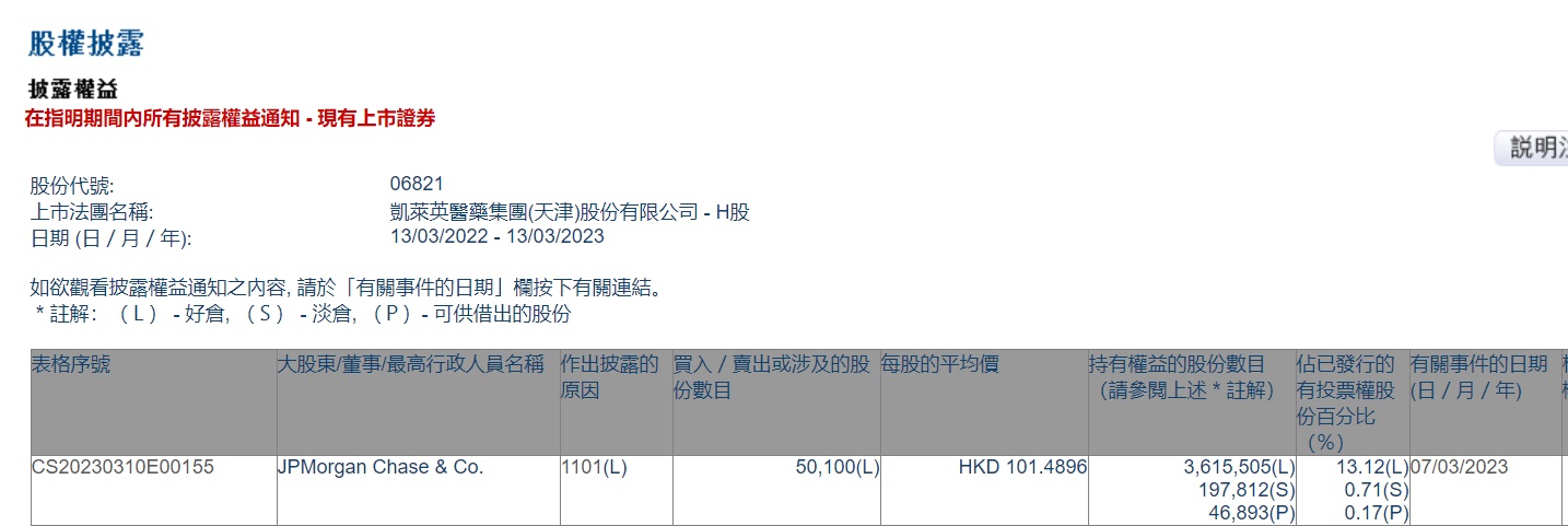 智通财经APP获悉,香港联交所最新资料显示,3月7日,小摩增持凯莱英(06821)5.01万股,每股作价101.4896港元,总金额约为508.46万港元。增持后最新持股数目约为361.55万股,最新持股比例为13.13%。