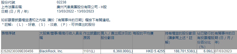 智通财经APP获悉,香港联交所最新资料显示,3月7日,贝莱德增持广汽集团(02238)636万股,每股作价5.4255港元,总金额约为3450.62万港元。增持后最新持股数目约为1.89亿股,最新持股比例为6.09%。
