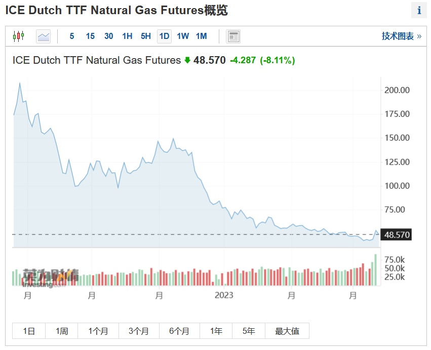 智通财经APP获悉,周一,德国的暴风雨天气可能会为该国带来创纪录的风力发电量,与此同时,北欧地区天气变暖也缓解了该地区能源系统的压力。受此消息影响,欧洲天然气价格回落。截至发稿,基准荷兰TTF天然气价格期货价格跌8.11%,报48.57欧元/兆瓦时。