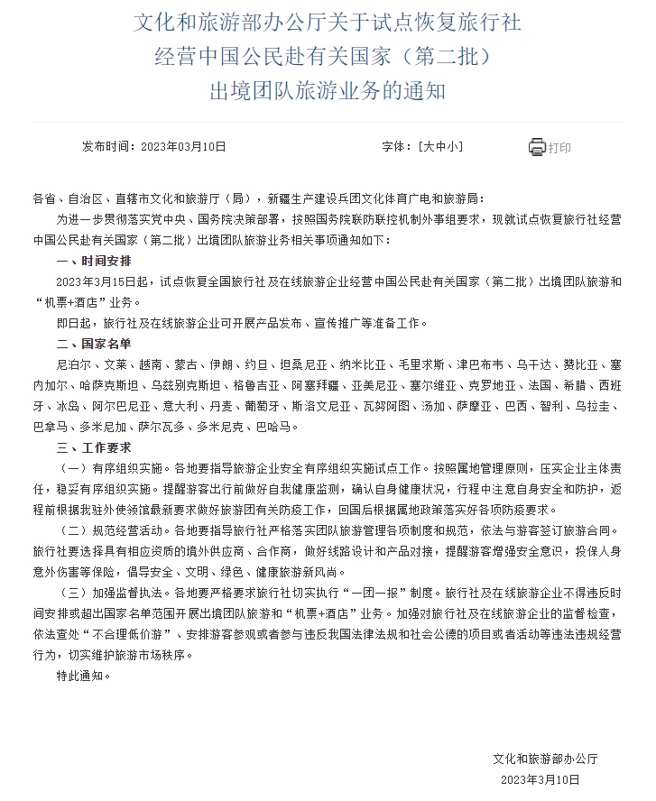 3月10日,文化和旅游部公布第二批试点出境团队游的国家名单,宣布将自3月15日起,开放中国前往第二批40个国家的出境跟团游和“机+酒”业务。消息发布后,各大平台出境游热度快速上涨。